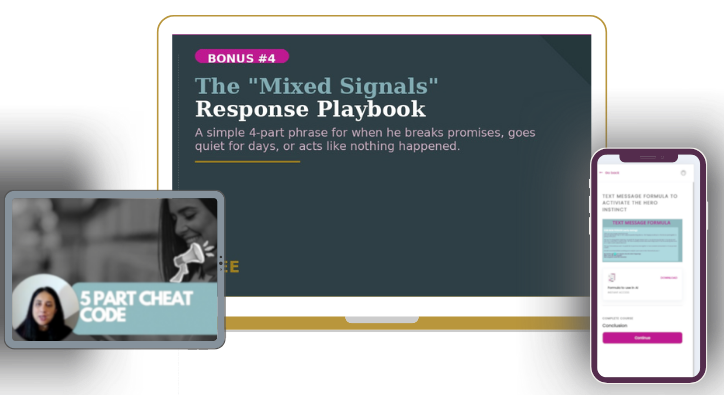 NEW Bonus #4:The "Mixed Signals" Response Playbook:Â Â What to say when he breaks promises, or goes quiet for days. (Value $197-FREE)
